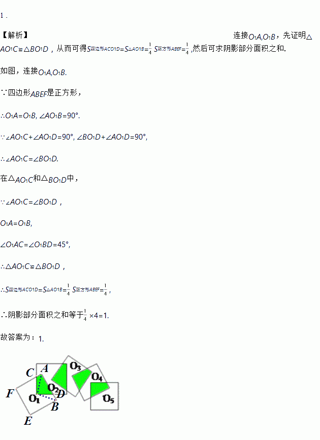 将5个边长为1的正方形按照如图所示方式摆放,O1,O2,O3,O4,O5是正方形对角线的交点,那么阴影部分面积之和等于________.
