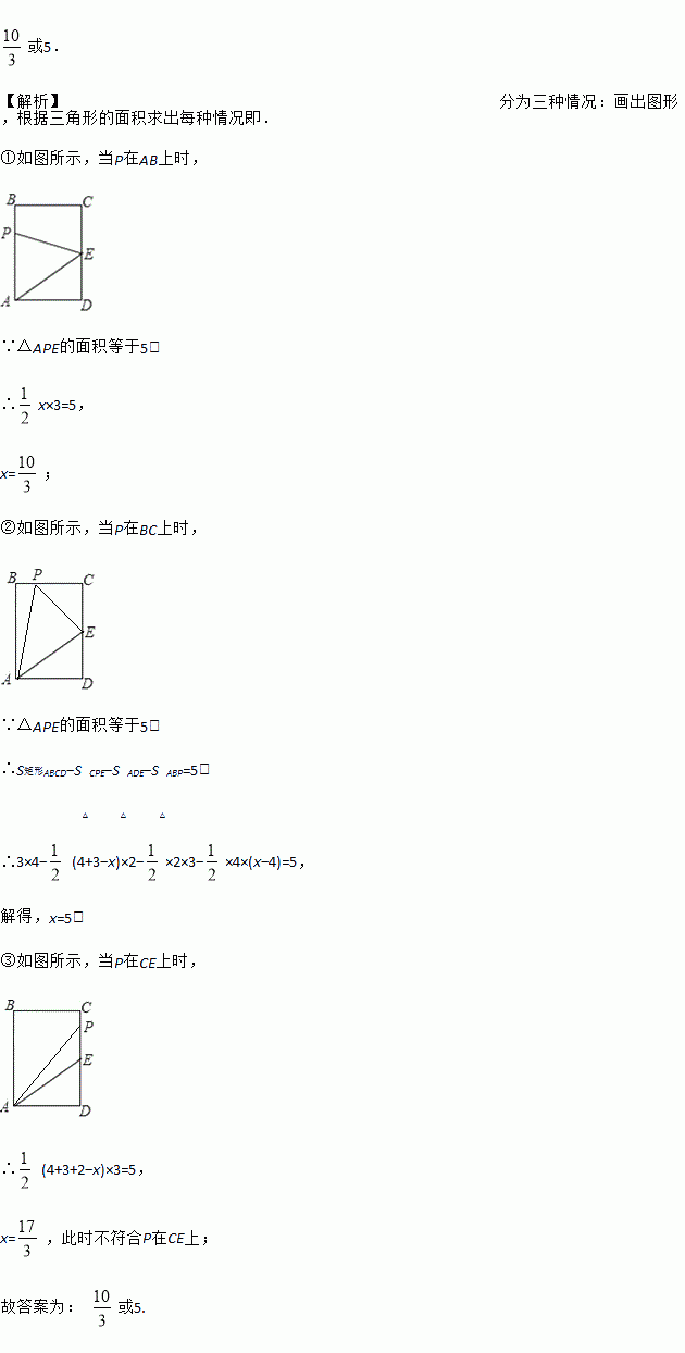 如图,长方形ABCD中,AB=4cm,BC=3cm,E为CD的中点.动点P从A点出发,以每秒1cm的速度沿A﹣B﹣C﹣E运动,最终到达点E.若点P运动的时间为x秒,则当x=__时,△APE的面积等于5.