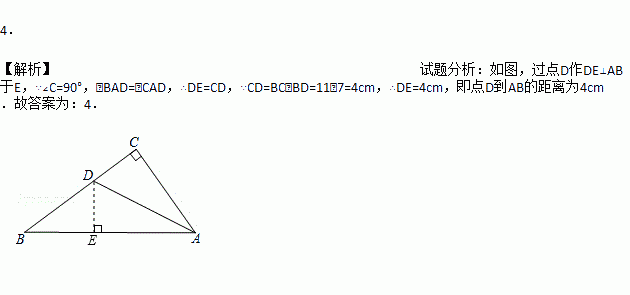 如图,∠C=90°,∠BAD =∠CAD,若BC=11 cm,BD=7 cm,则点D到AB的距离为____cm.
