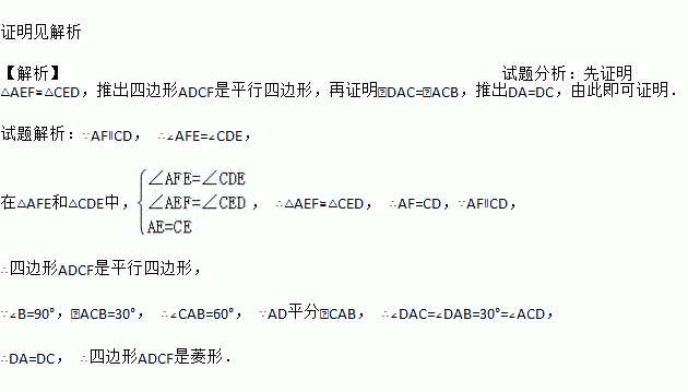如图,在Rt△ABC中,∠B=90°,点E是AC的中点,AC=2AB,∠BAC的平分线AD交BC于点D,作AF∥BC,连接DE并延长交AF于点F,连接FC.求证:四边形ADCF是菱形.