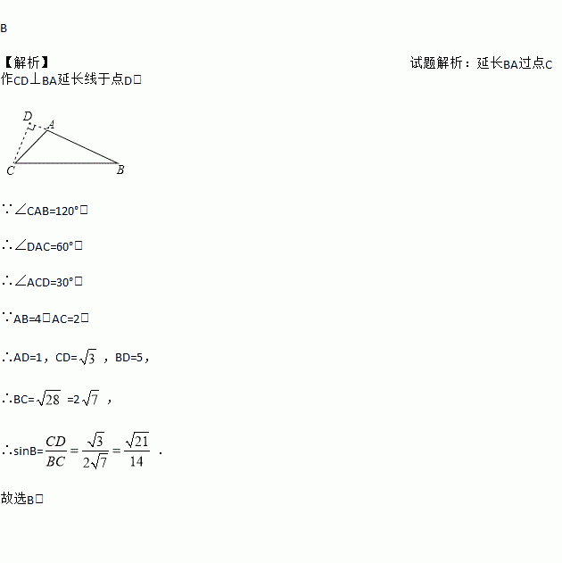 在△ABC中,∠A=120°,AB=4,AC=2,则sinB的值是( )
