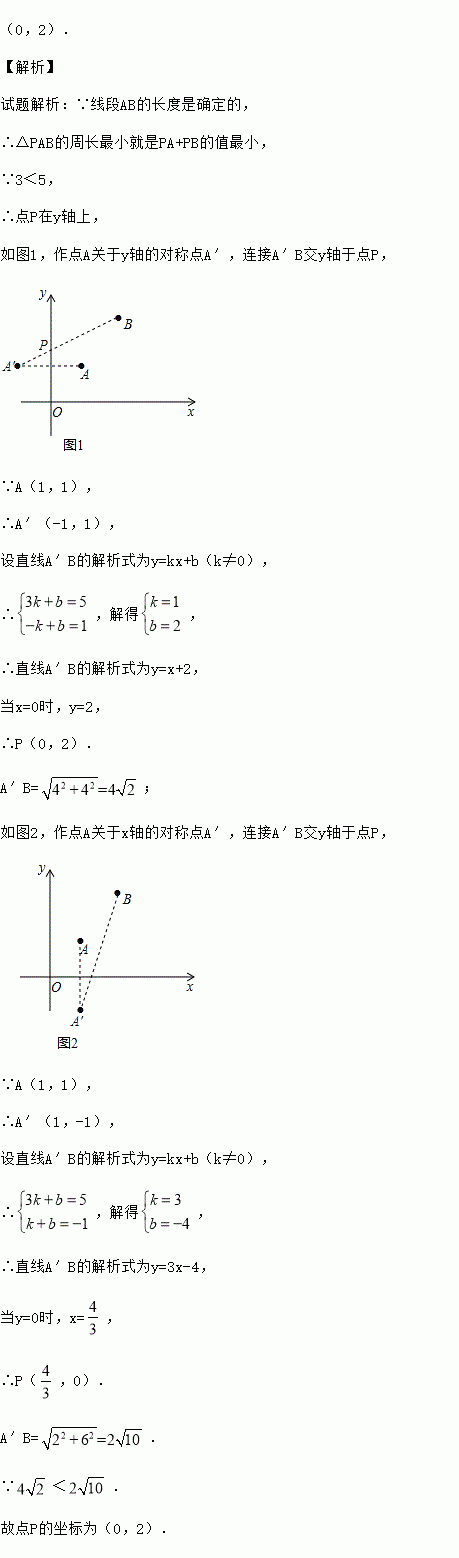 (0,2). 【解析】 试题解析:∵线段AB的长度是确定的, ∴△PAB的周长最小就是PA+PB的值最小, ∵3<5, ∴点P在y轴上, 如图1,作点A关于y轴的对称点A′,连接A′B交y轴于点P, ∵A(1,1), ∴A′(-1,1), 设直线A′B的解析式为y=kx+b(k≠0), ∴,解得, ∴直线A′B的解析式为y=x+2,...