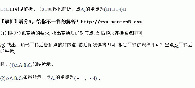 (2)以原点O为位似中心,将△ABC缩小,使变换后得到的△A2B2C2与△ABC对应边的比为1∶2.请在网格内画出在第三象限内的△A2B2C2,并写出点A2的坐标.