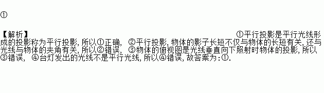 ① 【解析】①平行投影是平行光线形成的投影称为平行投影,所以①正确, ②平行投影,物体的影子长短不仅与物体的长短有关,还与光线与物体的夹角有关,所以②错误, ③物体的俯视图是光线垂直向下照射时物体的投影,所以③错误, ④台灯发出的光线不是平行光线,所以④错误,故答案为:①.