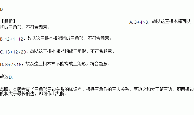 下列四组数分别是三根木棒的长度,用它们不能拼成三角形的是( )