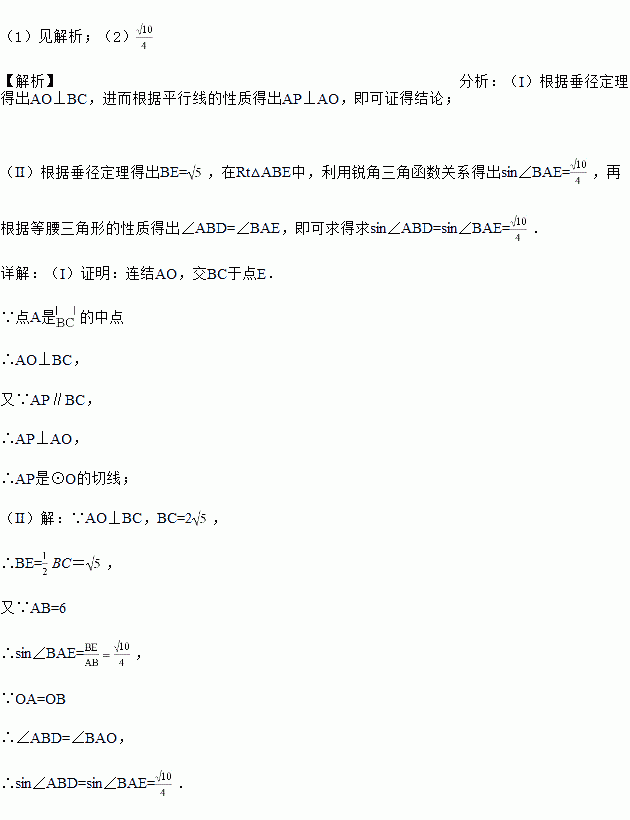 如图,⊙O中,点A为中点,BD为直径,过A作AP∥BC交DB的延长线于点P.