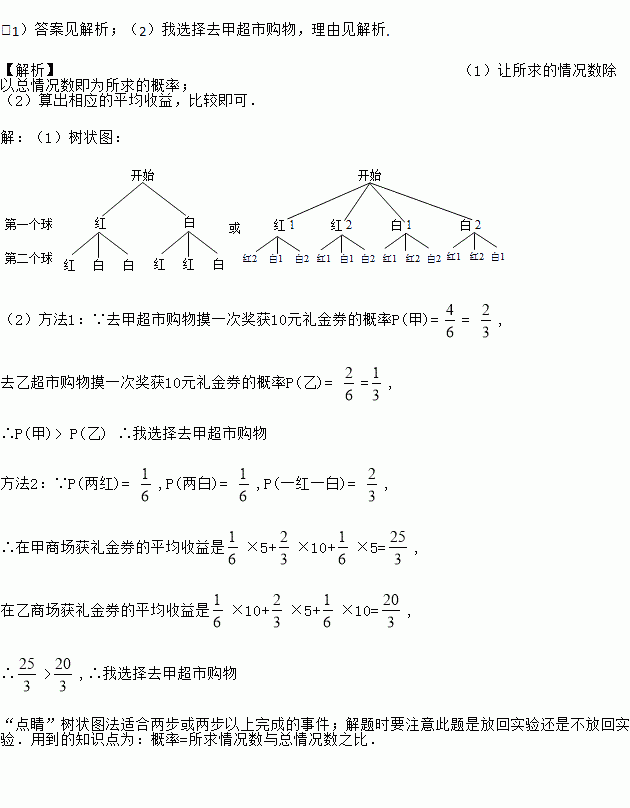甲、乙两超市(大型商场)同时开业,为了吸引顾客,都举行了有奖酬宾活动:凡购物满100元,均可得到一次摸奖的机会. 在一个纸盒里装有2个红求和2个白球,除颜色外其他都相同,摸奖者一次从中摸出两个球,根据球的颜色决定送礼金券(在他们超市使用时,与人民币等值)的多少(如下表)