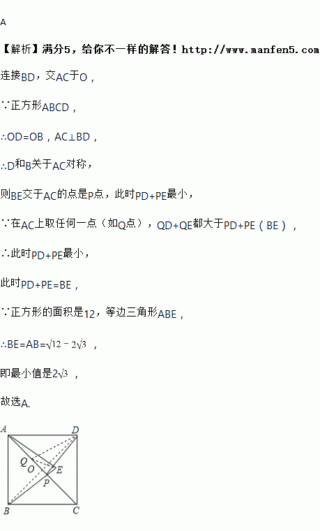 如图所示,正方形ABCD的面积为12,△ABE是等边三角形,点E在正方形ABCD内,在对角线AC上有一点P,使PD+PE的和最小,则这个最小值为 ( )