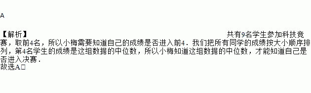 A 【解析】共有9名学生参加科技竞赛,取前4名,所以小梅需要知道自己的成绩是否进入前4.我们把所有同学的成绩按大小顺序排列,第4名学生的成绩是这组数据的中位数,所以小梅知道这组数据的中位数,才能知道自己是否进入决赛. 故选A.