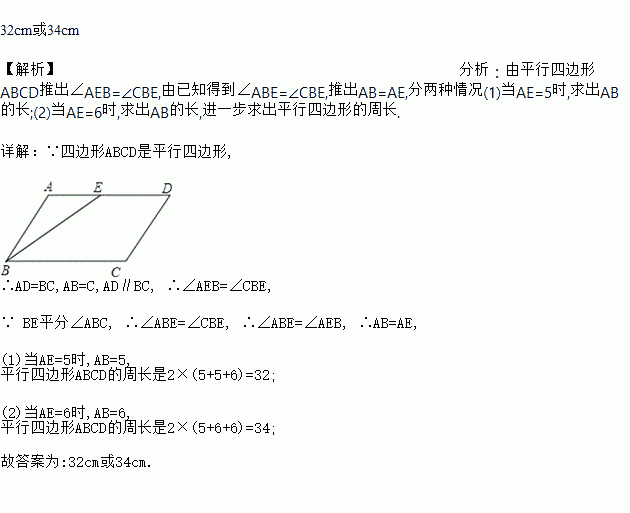 平行四边形ABCD中,∠ABC的角平分线BE将边AD分成长度为5cm和6cm的两部分,则平行四边形ABCD的周长为__________________cm.