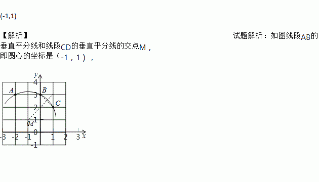 如图,在5×5正方形网格中,一条圆弧经过A,B,C三点,已知点A的坐标是(-2,3),点C的坐标是(1,2),那么这条圆弧所在圆的圆心坐标是_____________.