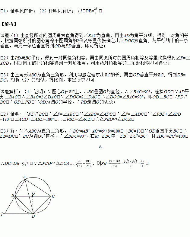 如图,⊙O是△ABC的外接圆,O点在BC边上,∠BAC的平分线交⊙O于点D,连接BD、CD,过点D作BC的平行线,与AB的延长线相交于点P.