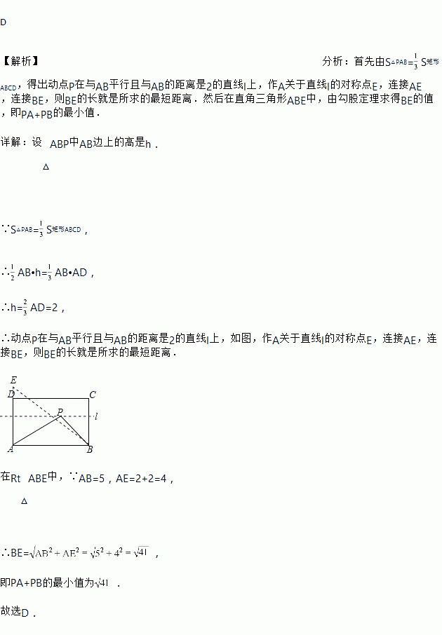 如图,在矩形ABCD中,AB=5,AD=3,动点P满足,则点P到A、B两点距离之和PA+PB的最小值为( )