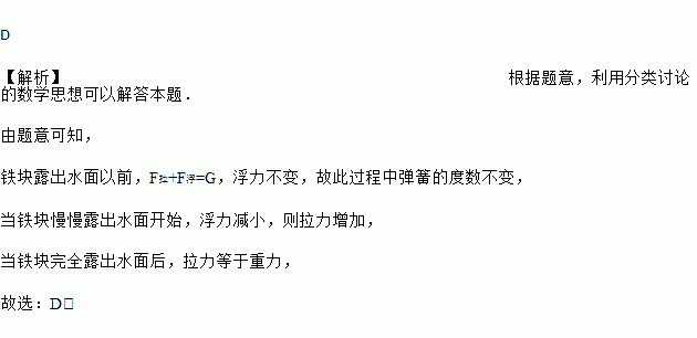如图,在物理课上,老师将挂在弹簧测力计下端的铁块浸没于水中,然后缓慢匀速向上提起,直至铁块完全露出水面一定高度,则下图能反映弹簧测力计的读数y(单位:N)与铁块被提起的高度x(单位:cm)之间的函数关系的大致图象是( )