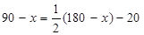 解析试题分析:设这个角的度数为x°,根据“余角比这个角的补角的一半小20°”即可列方程求解.