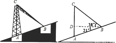 2008年初,我国南方部分省区发生了雪灾,造成通讯受阴.如图,现有某处山坡上一座发射塔被冰雪从C处压折,塔尖恰好落在坡面上的点B处,在B处测得点C的仰角为38°,塔基A的俯角为21°,又测得斜坡上点A到点B的坡面距离AB为15米,求折断前发射塔的高.(精确到0.1米)