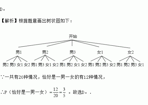 (2013年四川绵阳3分)“服务他人,提升自我”,七一学校积极开展志愿者服务活动,来自初三的5名同学(3男两女)成立了“交通秩序维护”小分队,若从该小分队中任选两名同学进行交通秩序维护,则恰好是一男一女的概率是【 】