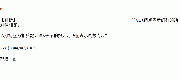B 【解析】∵A,B两点表示的数的绝对值相等, ∴A、B互为相反数,设A表示的数为x,则B表示的数为-x, ∴x-(-x)=4,x=2,x-=-2. 故选:B.