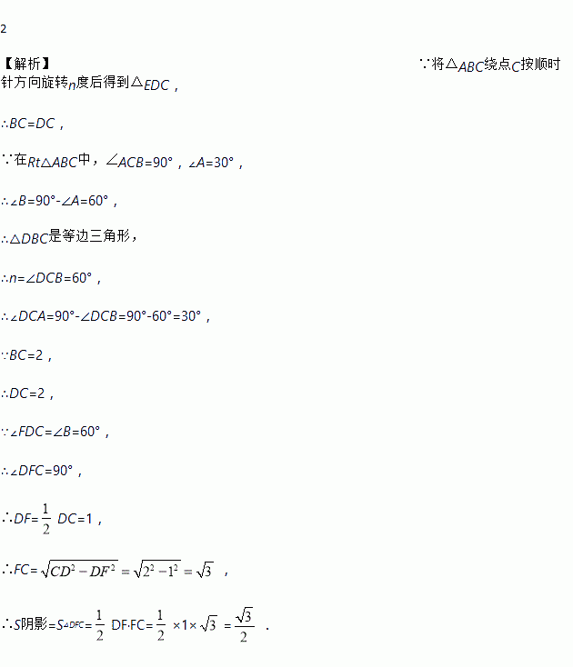 如图,Rt△ABC中,∠ACB=90°,∠A=30°,BC=2.将△ABC绕点C按顺时针方向旋转一定角度后得△EDC,点D在AB边上,斜边DE交AC于点F,则图中阴影部分面积为__________.