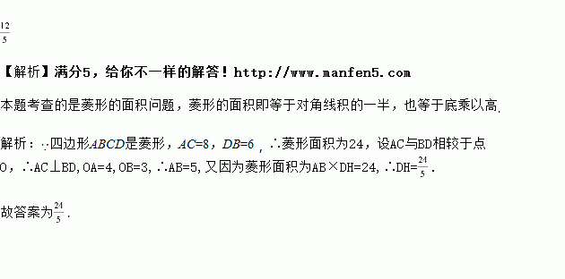 如图,四边形ABCD是菱形,AC=8,DB=6,DH⊥AB于点H,则DH=_____.