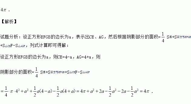如图,正方形ABCD的边长为4,点E在BC上,四边形EFGB也是正方形,以B为圆心,BA长为半径画圆,连结AF,CF,则图中阴影部分面积为 .