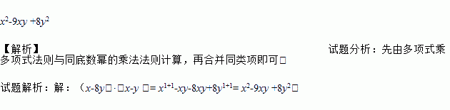 x2-9xy +8y2 【解析】试题分析:先由多项式乘多项式法则与同底数幂的乘法法则计算,再合并同类项即可. 试题解析:【解析】 (x-8y)·(x-y )= x1+1-xy-8xy+8y1+1= x2-9xy +8y2.
