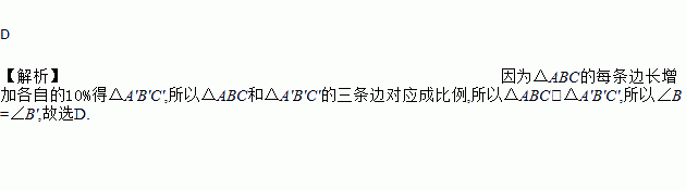D 【解析】因为△ABC的每条边长增加各自的10%得△A′B′C′,所以△ABC和△A′B′C′的三条边对应成比例,所以△ABC∽△A′B′C′,所以∠B=∠B′,故选D.