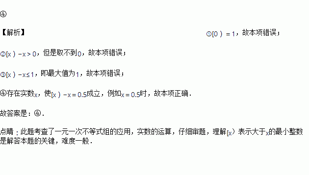 设表示大于的最小整数,如, ,则下列结论中正确的是_________。(填写所有正确结论的序号)①;②的最小值是0;③的最大值是0;④存在实数,使成立。