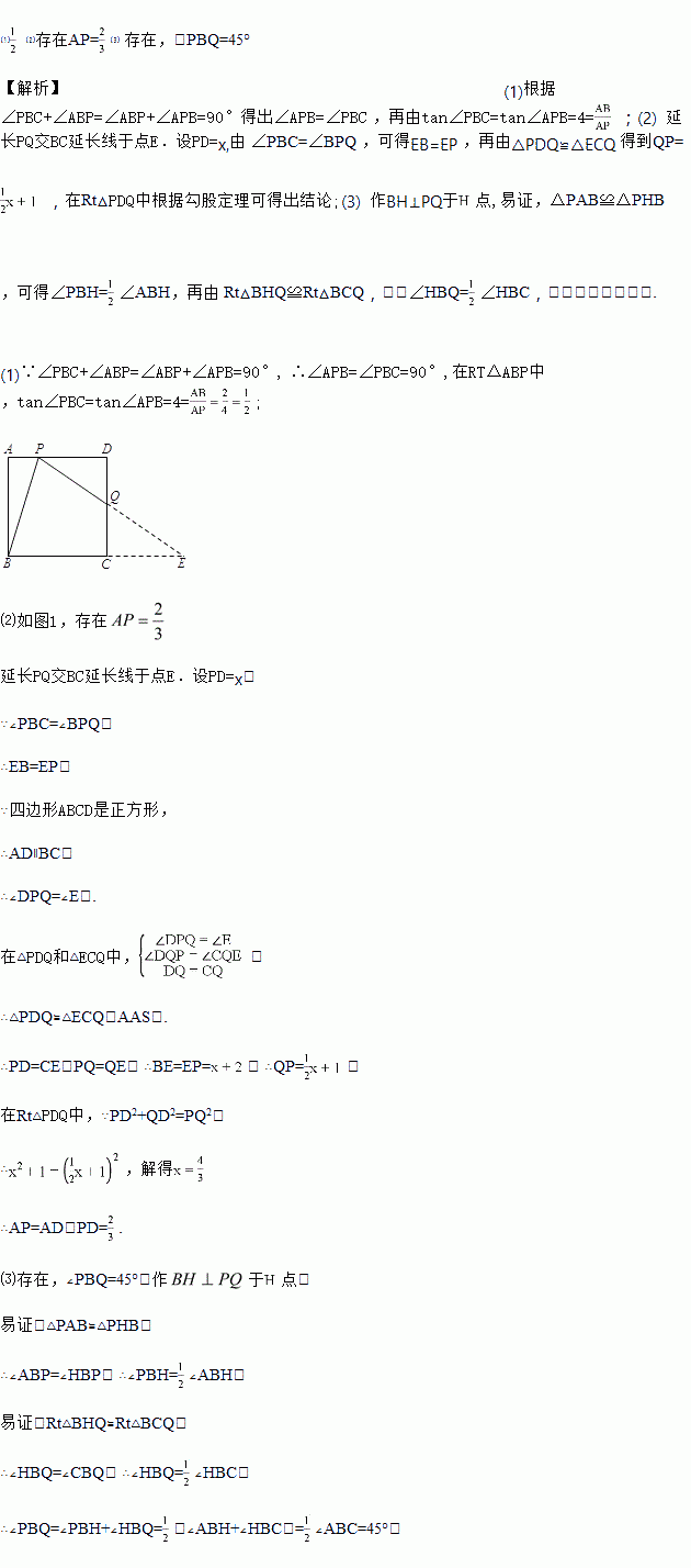 ⑵ 是否存在点P,使得点Q恰好是边CD的中点?若存在,求出AP的长;若不存在,请说明理由.⑶ 连接BQ,在△PBQ中是否存在度数不变的角?若存在,指出这个角,并求出它的度数;若不存在,请说明理由.
