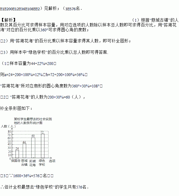 (3)若该校共有1600名学生,请估计全校最想去“绿色学校”的学生共有多少名?