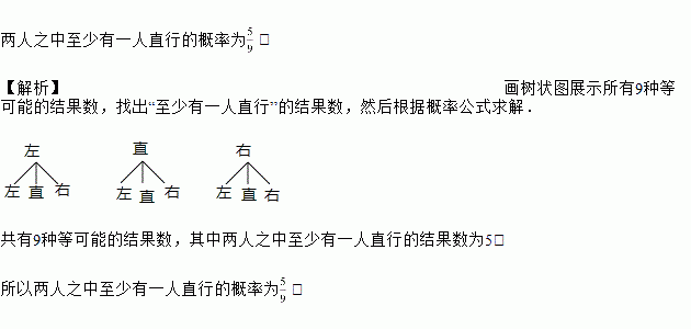 经过校园某路口的行人,可能左转,也可能直行或右转.假设这三种可能性相同,现有小明和小亮两人经过该路口,请用列表法或画树状图法,求两人之中至少有一人直行的概率.