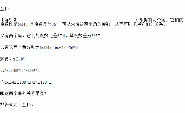 两个角,它们的比是6:4,其差为36º,则这两个角的关系是________.