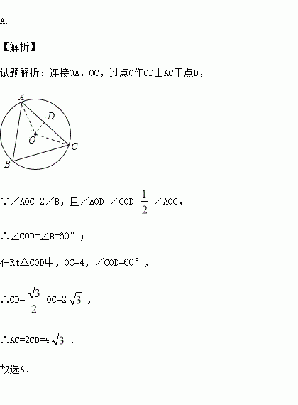 如图,⊙O是△ABC的外接圆,∠B=60°,⊙O的半径为4,则AC的长等于( )