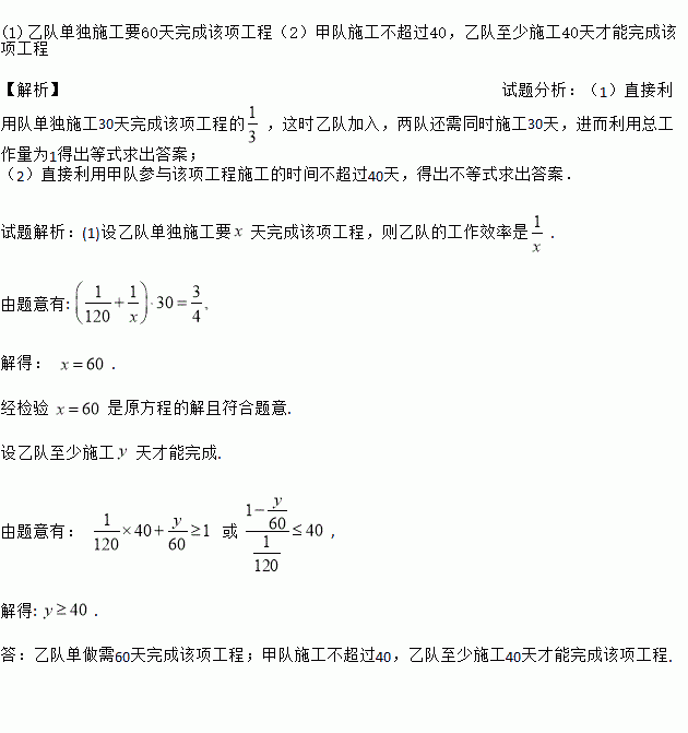 (1)乙队单独施工要60天完成该项工程(2)甲队施工不超过40,乙队至少施工40天才能完成该项工程 【解析】试题分析:(1)直接利用队单独施工30天完成该项工程的,这时乙队加入,两队还需同时施工30天,进而利用总工作量为1得出等式求出答案; (2)直接利用甲队参与该项工程施工的时间不超过40天,得出不等式求出答案. 试题解析:(1)设乙队单独施工要天完成该项工程,则乙队的工作效率是....