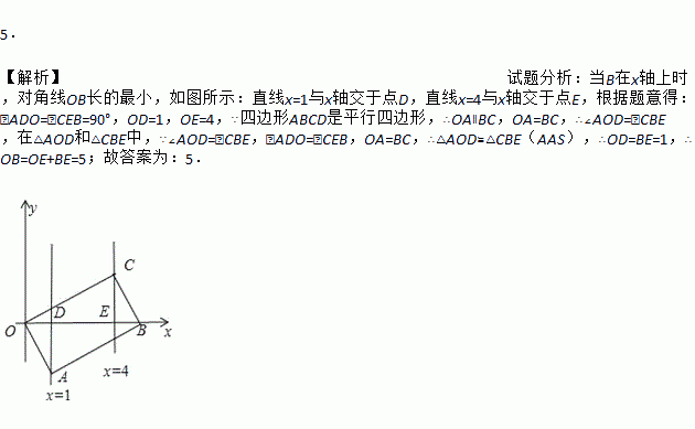 如图,已知?OABC的顶点A、C分别在直线x=1和x=4上,O是坐标原点,则对角线OB长的最小值为__.