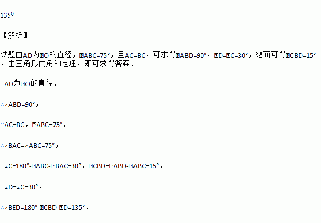 如图,AD为⊙O的直径,∠ABC=75°,且AC=BC,则∠BED=____________度.