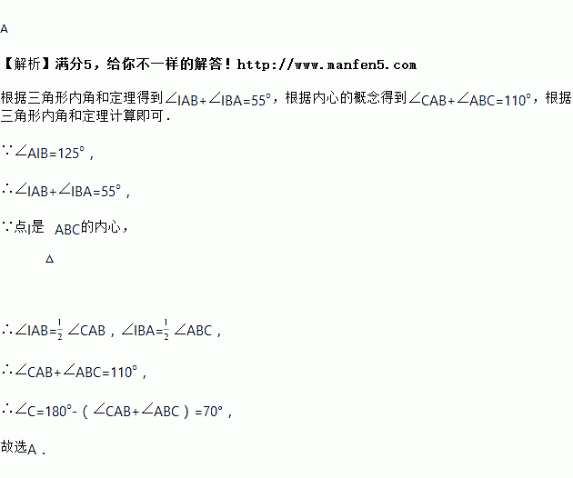 如图,点I是△ABC的内心,若∠AIB=125°,则∠C等于( )