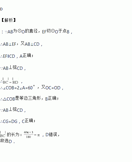 如图,AB为⊙O的直径,AB=6,AB⊥弦CD,垂足为G,EF切⊙O于点B,∠A=30°,连接AD,OC,BC,下列结论不正确的是( )