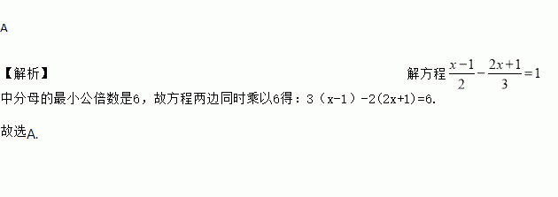 A 【解析】解方程中分母的最小公倍数是6,故方程两边同时乘以6得:3(x-1)-2(2x+1)=6. 故选A.