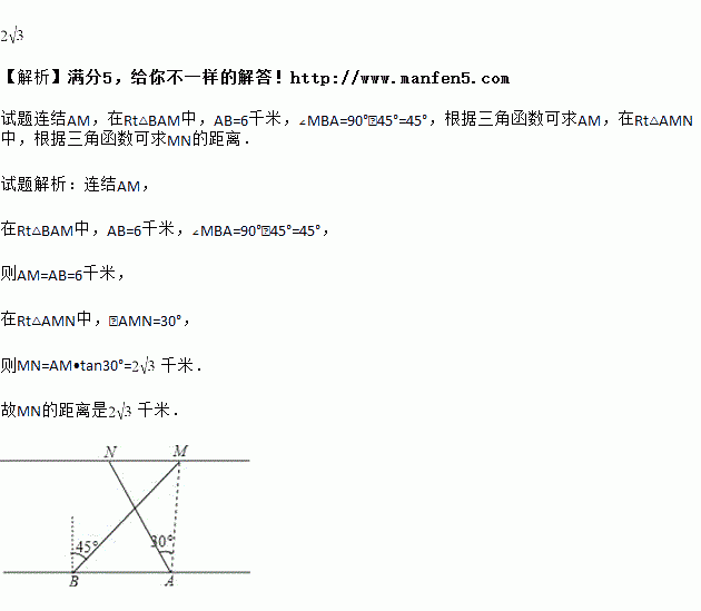 如图,小明在河的南岸A点测得北岸上的M点在正北方向,N点在北偏西30°方向,他向西行6千米到达B点,测得M点在北偏东45°方向,已知南北两岸互相平行,求MN的距离(结果保留根号)