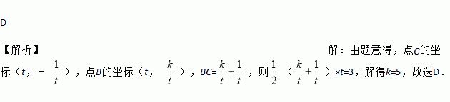 D 【解析】【解析】 由题意得,点C的坐标(t,﹣ ),点B的坐标(t, ),BC=,则()×t=3,解得k=5,故选D.