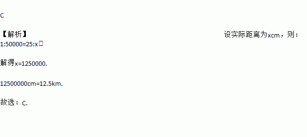 在比例尺为1:50000的地图上,量得甲、乙两地的距离为25cm,则甲、乙两地的实际距离是( )