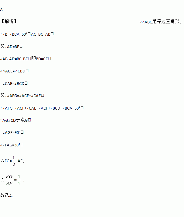 如图,等边三角形ABC中,D、E分别为AB、BC边上的两动点,且总使AD=BE,AE与CD交于点F,AG⊥CD于点G,则=( )