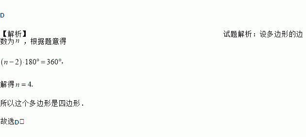 D 【解析】试题解析:设多边形的边数为,根据题意得 解得 所以这个多边形是四边形. 故选D.
