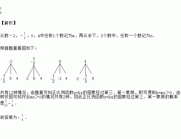 从数﹣2,﹣ ,0,4中任取一个数记为m,再从余下的三个数中,任取一个数记为n,若k=mn,则正比例函数y=kx的图象经过第三、第一象限的概率是________.