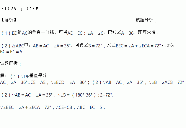 如图,△ABC中,AB=AC,∠A=36°,AC的垂直平分线交AB于E,D为垂足,连接EC.