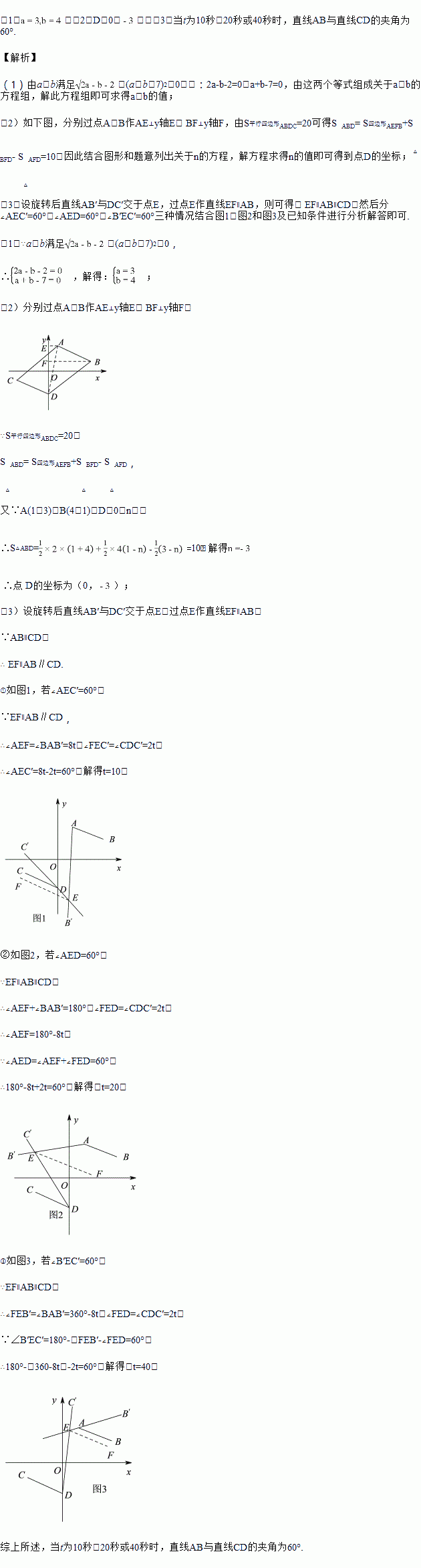(3)在(2)的条件下,将线段AB绕点A以每秒80的速度顺时针旋转,同时线段CD绕点D以每秒20的速度顺时针旋转(当AB旋转到一周时两线段同时停止旋转),设运动时间为t秒,当t为何值时,直线AB与直线CD的夹角为600?请说明理由.