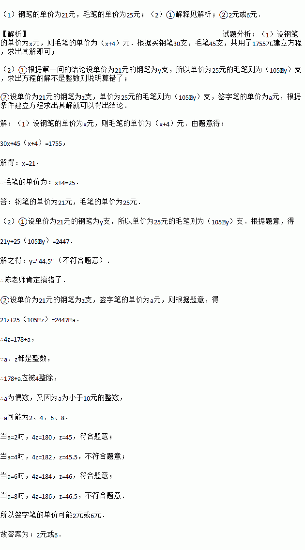 (1)钢笔的单价为21元,毛笔的单价为25元;(2)①解释见解析;②2元或6元. 【解析】试题分析:(1)设钢笔的单价为x元,则毛笔的单价为(x+4)元.根据买钢笔30支,毛笔45支,共用了1755元建立方程,求出其解即可; (2)①根据第一问的结论设单价为21元的钢笔为y支,所以单价为25元的毛笔则为(105﹣y)支,求出方程的解不是整数则说明算错了; ②设单价为21元的钢笔为...