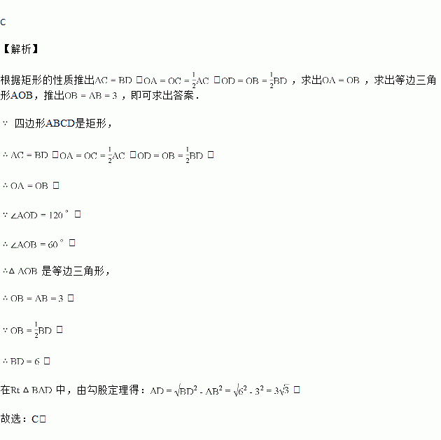 如图,矩形ABCD中,,两条对角线AC,BD所夹的钝角为,则边AD的长为