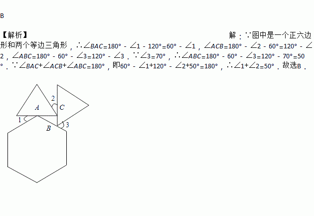 一个正六边形和两个等边三角形的位置如图所示,∠3=70°,则∠1+∠2=( )